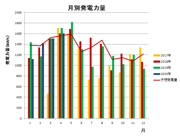 2017年7月~9月までの発電量が予想より大幅に少ないのは、上記したようにデータが送信できなかった日が比較的多かったためです。特に7月は送信できなかった日が9日と多かったため、発電量が最も低くなっています。その後は、ほぼ予想通りの発電量が得られています。